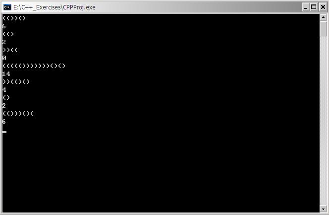 #include <iostream>#include <stack>#include <string>#include <string.h>using namespace std;int main(int argc,char **argv){ string line; int i,cnt=0; stack<char> s; for(;cin>>line;){ char *cs=new char[line.size()+1]; memset(cs,0,line.size()+1); memcpy(cs,line.c_str(),line.size()); s.push(cs[0]); for(cnt=0,i=1;i<line.size();++i){ if(cs[i]==')'&&!s.empty()&&s.top()=='(') { cnt+=2; s.pop(); }else s.push(cs[i]); } cout<<cnt<<endl; delete cs; for(;!s.empty();) s.pop(); } return 0; }