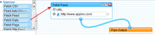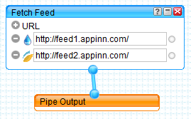 打开Yahoo Pipes之后,用你的Yahoo ID登录,然后点击Create a pipe创建一个新的pipe,在左边面板拖拽一个Fetch Feed到右边的画布,然后输入你想要隐藏的Feed地址,比如小众软件的网址:http://feed.appinn.com/。然后把 Fetch Feed 连接到 Pipe Output上,如图。