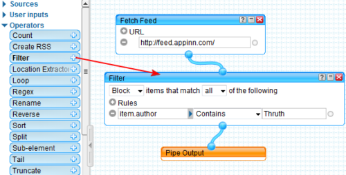 比如你不喜欢小众软件介绍Mac软件的文章,而这些文章刚好是 @Thruth 发的,那么你可以轻松利用 Yahoo Pipes,干掉他。其实小众软件已经提供了订阅指南,根本不必自己动手,这只是一个举例而已。