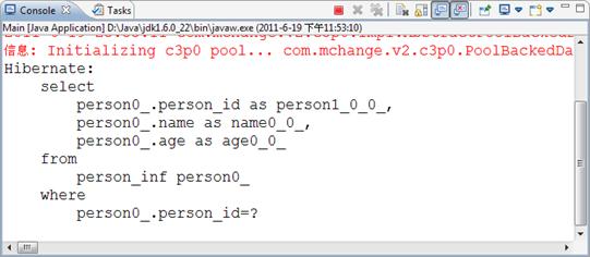 单击图 4 所示 Variables 窗口中的 person 属性(也就是在调试模式下强行使用 person 属性),此时看到 Eclipse 的 Console 窗口输出如下的 SQL 语句: