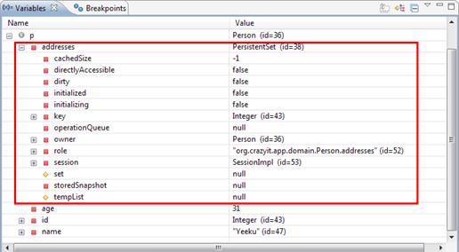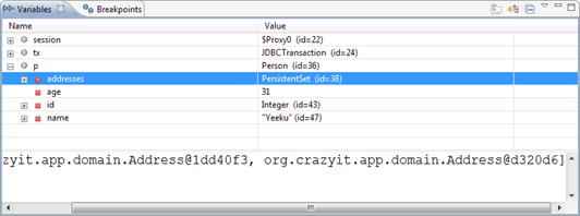 这就是 PersistentSet 集合跟据 owner 属性去抓取特定 Address 记录的 SQL 语句。此时可以从 Eclipse 的 Variables 窗口看到图 3 所示的输出: