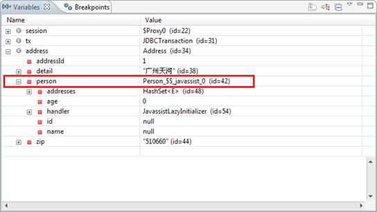 从图 4 可以清楚地看到,此时 Address 实体所关联的 Person 实体并不是 Person 对象,而是一个 Person_$$_javassist_0 类的实例,这个类是 Hibernate 使用 Javassist 项目动态生成的代理类——当 Hibernate 延迟加载关联实体时,将会采用 Javassist 生成一个动态代理对象,这个代理对象将负责代理“暂未加载”的关联实体。