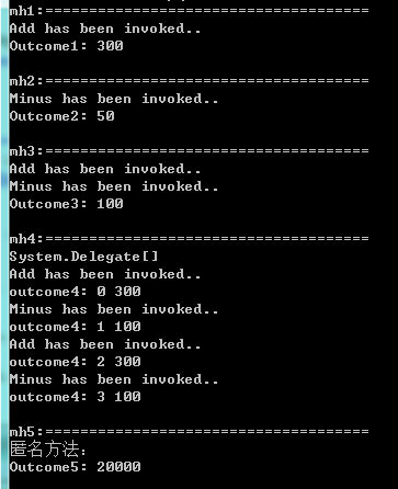 using System;// 创建一个delegatedelegate int MyHandler(int d1, int d2); class Test{public static int Add(int x, int y){Console.WriteLine("Add has been invoked..");return x+y;}public int Minus(int x, int y){Console.WriteLine("Minus has been invoked..");return x-y;}public static void Main(){Console.WriteLine("mh1:=====================================");MyHandler mh1 = new MyHandler(Test.Add);//绑定静态方法;Console.WriteLine("Outcome1: "+ mh1(100, 200));//==>mh1.Invoke(100, 200); ==> {jump Test.Add;}Console.WriteLine();Console.WriteLine("mh2:=====================================");Test t = new Test();MyHandler mh2 = new MyHandler(t.Minus);//绑定动态方法,这里其实传了两个参数:t和&Minus;Console.WriteLine("Outcome2: "+ mh2(100, 50));Console.WriteLine();Console.WriteLine("mh3:=====================================");MyHandler mh3 = mh1 + mh2;// ;构建委托链;有序的;Console.WriteLine("Outcome3: "+ mh3(200, 100));//依次执行mh1,mh2;返回值是最后一个委托方法的返回值,在此为mh2的返回值;Console.WriteLine();Console.WriteLine("mh4:=====================================");MyHandler mh4 = mh1 + mh2 + mh3;Delegate[] mhs = mh4.GetInvocationList(); //使用Delegate的GetInvocationList()方法可以数组的形式获得委托链中的每一个委托,从而实现对于委托链的随机访问;Console.WriteLine(mhs);for(int i = 0; i<mhs.Length; i++) //遍历委托链;{MyHandler tempHandler =(MyHandler)mhs[i];Console.WriteLine("outcome4: " + i + " " + tempHandler(200, 100));}Console.WriteLine();Console.WriteLine("mh5:=====================================");MyHandler mh5 = delegate(int x, int y){ //绑定匿名方法;Console.WriteLine("匿名方法:");return x*y;};Console.WriteLine("Outcome5: " + mh5(100,200));}}