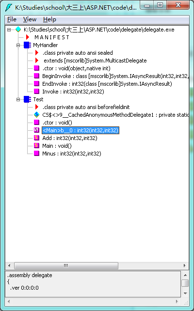 class MyHandler : MulticastDelegate{//构造器;public MyHandler(Object object, IntPtr method);//这个方法和源代码指定的原型一样;public virtual void Invoke(int d1, int d2);//以下方法实现了对回调方法的异步回调,具体还没有研究过。。。public virtual IAsyncResult BeginInvoke(...);public irtual void EndInvoke(...);} //MulticastDelegate内最主要的是包含了三个静态字段:class MulticastDelegate{private Object _target; //这个字段用来指出要传给实例方法的隐式参数this的值;//当委托对象包装的是一个静态方法时,这个字段为null;//当委托对象包装一个实例方法时,这个字段引用的是回调函数要操作的对象;private IntPtr _method;//一个内部的整数值,CLR用它标示要回调的方法;可以理解为一个函数指针;private Object _invocationList;//用来指向委托链中的下一个委托对象;//...}