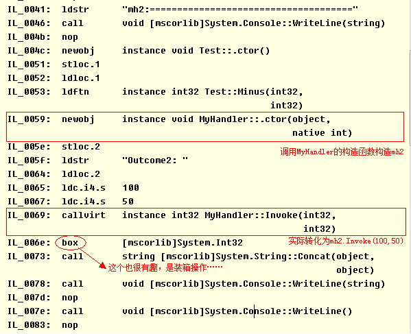 Console.WriteLine("mh2:=====================================");Test t = new Test();MyHandler mh2 = new MyHandler(t.Minus);//绑定动态方法,这里其实传了两个参数:t和&Minus;Console.WriteLine("Outcome2: "+ mh2(100, 50));Console.WriteLine();