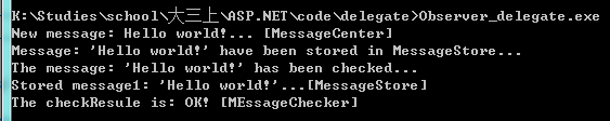 using System;//using System.Collections;interface ReceiveMessage{void storeMessage(String message);}//创建委托类型;delegate void ReceiverList(String message);class MessageCenter{private String messageString; // MessageCenter用来缓存消息的String字段;//private ArrayList receiverList = new ArrayList();private ReceiverList receiverList; //has a delegate;//添加消息接受者;public void addReceiver(ReceiveMessage receiver){//receiverList.Add(receiver);receiverList += new ReceiverList(receiver.storeMessage);}//移除消息接受者;public void removeReceiver(ReceiveMessage receiver){//receiverList.Remove(receiver);receiverList -= new ReceiverList(receiver.storeMessage);}// 新建消息;public void newMessage(String message){Console.WriteLine("New message: " + message + "... [MessageCenter]" );this.messageString = message;}// 通知MessageStore有新消息,将其备份入MessageStore;//public void notice(MessageStore messageStore)/*public void notice(ReceiveMessage messageStore) //将对象参数类型换成接口类型;{//messageStore.MessageString = this.messageString;//Console.WriteLine("Message: '" + messageString + "' have been stored in MessageStore...");messageStore.storeMessage(this.messageString);}*/public void notice()//// 通知所有已注册的receiver有新消息,并调用其storeMessage方法;{/*foreach(Object receiver in receiverList){(receiver as ReceiveMessage).storeMessage(this.messageString);}*/this.receiverList(this.messageString);}}class MessageStore : ReceiveMessage{private String messageString;// MessageStore用户存储消息的String字段;// 其实应该是一个String容器用来存储多条消息,不过在此为了简单只放一条消息;public String MessageString{get{return messageString;}set{this.messageString = value;}}/*public void storeMessage(String message) { this.messageString = message; Console.WriteLine("Message: '" + this.messageString + "' have been stored in MessageStore..."); } */ public void storeMessage(String message) //实现接口方法storeMessage(String message); { this.messageString = message; Console.WriteLine("Message: '" + this.messageString + "' have been stored in MessageStore..."); }// 列出MessageStore中已存储的消息;public void listMessages(){Console.WriteLine("Stored message1: '" + this.messageString + "'...[MessageStore]");}}class MessageChecker : ReceiveMessage{private String checkResult;public void storeMessage(String message) //实现接口方法storeMessage(String message);{this.checkResult = "OK!";Console.WriteLine("The message: '" + message + "' has been checked...");}public void showCheckResult(){Console.WriteLine("The checkResule is: " + this.checkResult + " [MEssageChecker]");}}class Test{public static void Main(){MessageCenter messageCenter = new MessageCenter();MessageStore messageStore = new MessageStore();MessageChecker messageChecker = new MessageChecker();messageCenter.addReceiver(messageStore);messageCenter.addReceiver(messageChecker);messageCenter.newMessage("Hello world!"); //新建消息Hello world;//messageCenter.notice(messageStore);//通知messageStore有消息需要存储;messageCenter.notice();messageStore.listMessages();//列出messageStore中已经存储的消息;messageChecker.showCheckResult(); //显示messageChecker的checkResule;}}