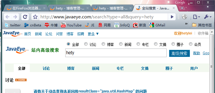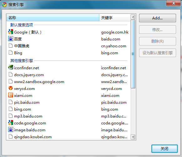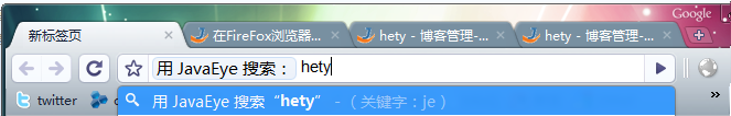 在Chrome浏览器的地址栏使用JavaEye站内搜索功能 看了在FireFox浏览器的搜索框使用JavaEye站内搜索功能研究了一下chrome的地址栏搜索,比FF要强大的多,不需要像FF一样去搜索栏来回切换搜索引擎。右键点击地址栏->修改搜索引擎,带搜索功能的网站chrome都帮你记住了找到javaeye把其关键字改为'je'在地址栏敲'je'就弹出使用javaeye进行搜索的提示按tab后输入关键字回车就OK
