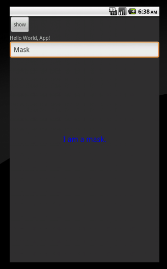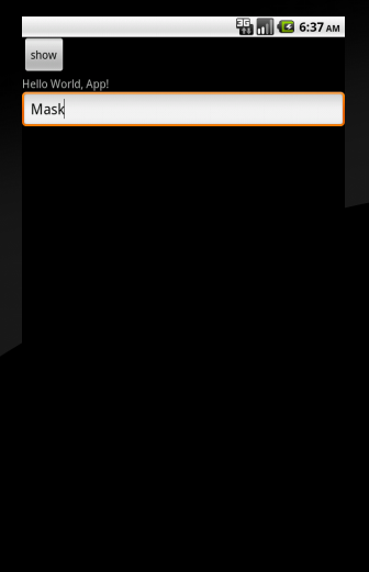 <?xml version="1.0" encoding="utf-8"?><FrameLayout xmlns:android="http://schemas.android.com/apk/res/android" android:id="@+id/layout" android:layout_width="fill_parent" android:layout_height="fill_parent" > <LinearLayout android:orientation="vertical" android:layout_width="fill_parent" android:layout_height="fill_parent" > <Button android:id="@+id/btn" android:layout_width="wrap_content" android:layout_height="wrap_content" android:layout_alignParentRight="true" android:text="show" /><TextView android:layout_width="fill_parent" android:layout_height="wrap_content" android:text="@string/hello" /><EditText android:layout_width="fill_parent" android:layout_height="wrap_content" android:text="Mask" /></LinearLayout></FrameLayout>