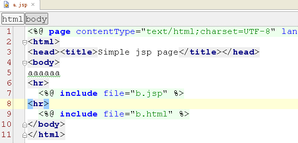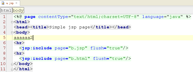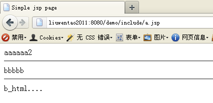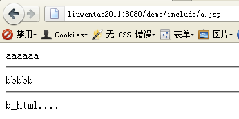 指令元素 <%@ include file=" "%> ;行为元素 <jsp:include page=" " flush="true"/> 首先 2者都只能引入 相对的URI.不能引入其他网站的内容。a. 指令元素 : <%@ include file="b.jsp"%>