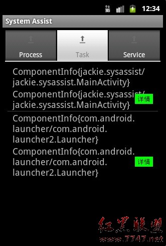/** * 获取系统的任务信息,需要用户权限:android.permission.GET_TASKS *  * ActivityManager.RunningTaskInfo { *     public ComponentName baseActivity    // 任务做为第一个活动的组件信息 *     public CharSequence description        // 任务当前状态的描述 *     public int id                        // 任务的ID *     public int numActivities                // 任务中所包含的活动的数目 *     public int numRunning                // 任务中处于运行状态的活动数目 *     public Bitmap thumbnail                // 任务当前状态的位图表示,目前为null *     public ComponentName topActivity        // 处于任务栈的栈顶的活动组件 * } */package crazypebble.sysassist.taskmgr;import crazypebble.sysassist.R;import java.util.ArrayList;import java.util.HashMap;import java.util.Iterator;import java.util.List;import android.app.ActivityManager;import android.app.ListActivity;import android.app.ActivityManager.RunningTaskInfo;import android.os.Bundle;import android.widget.SimpleAdapter;public class TaskMgrActivity extends ListActivity{    private static List<RunningTaskInfo> taskList = null;    private static final int maxTaskNum = 100;        @Override    public void onCreate(Bundle savedInstanceState) {        super.onCreate(savedInstanceState);        setContentView(R.layout.task_list);                taskList = new ArrayList<RunningTaskInfo>();        getTaskInfo();                showTaskInfo();    }        public void showTaskInfo() {                // 更新进程列表        List<HashMap<String,String>> infoList = new ArrayList<HashMap<String,String>>();        for (Iterator<RunningTaskInfo> iterator = taskList.iterator(); iterator.hasNext();) {            RunningTaskInfo taskInfo = iterator.next();            HashMap<String, String> map = new HashMap<String, String>();            map.put("task_name", taskInfo.baseActivity.toString());            map.put("task_id", taskInfo.topActivity.toString());            infoList.add(map);        }                SimpleAdapter simpleAdapter = new SimpleAdapter(                this,                 infoList,                 R.layout.task_list_item,                 new String[]{"task_name", "task_id"},                new int[]{R.id.task_name, R.id.task_id} );        setListAdapter(simpleAdapter);    }        public int getTaskInfo() {        ActivityManager activityManager = (ActivityManager) getSystemService(ACTIVITY_SERVICE);        taskList = activityManager.getRunningTasks(maxTaskNum);        return taskList.size();    }}c、获取系统中的所有服务的信息