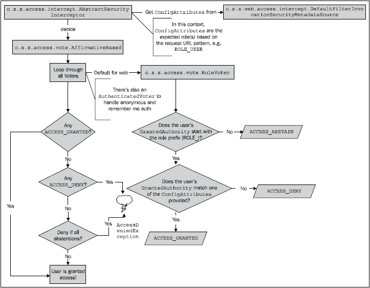 As you may have guessed from the design of access decision-related objects and interfaces, this portion of Spring Security has been designed so that it can be applicable to authentication and access control scenarios that aren't exclusively in the web domain. We'll encounter voters and access decision managers when we look at method-level security in Chapter 5, Fine-Grained Access Control.