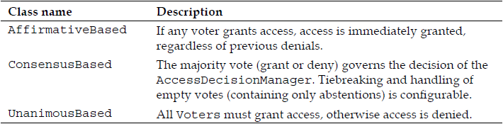 Smart object-oriented design is pervasive within the Spring Security framework, and authorization decision management is no exception. Recall from our discussion earlier in the chapter that a component known as the access decision manager is responsible for making authorization determinations.