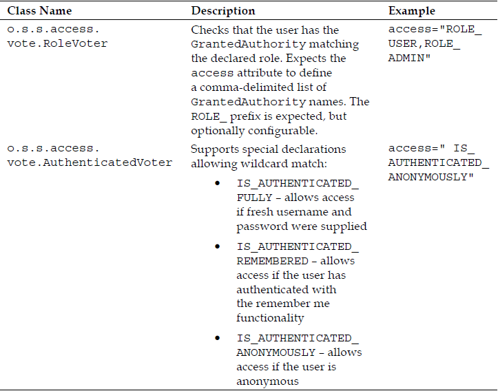 You may be wondering what the decisionVoters property is about. This property is auto-configured until we declare our own AccessDecisionManager. The default AccessDecisionManager requires us to declare the list of voters who are consulted to arrive at the authentication decisions. The two voters listed here are the defaults supplied by the security namespace configuration.