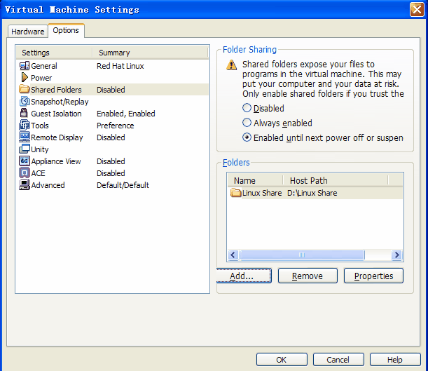 1.打开虚拟机,VM->Settings,在设置界面选择Options,再在下面选择Share Floders,选择右边第三项,在主机某个盘新建一个share文件夹,然后设置好后如图