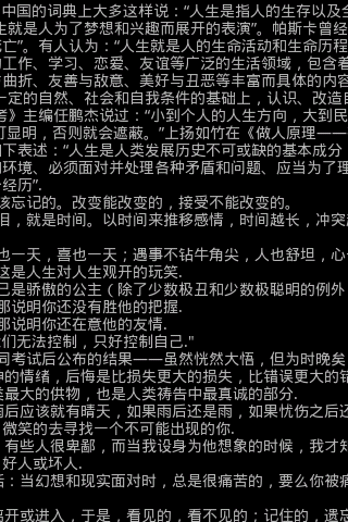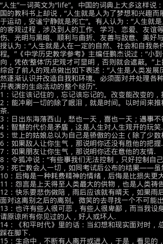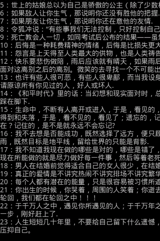 public class Test_ScrollingText extends Activity implements OnTouchListener, OnGestureListener { // 实现触摸和手势的接口 private TextView mContent; private DisplayMetrics metrics; private int mScreenWidth, mScreenHeight;// 屏幕分辨率 private GestureDetector mDetector;// 手势监听者 private String mDisplayTxt = ""; private int mCurrentX = 0, mCurrentY = 0;// TextView左上角的像素值 /** Called when the activity is first created. */ @Override public void onCreate(Bundle savedInstanceState) { super.onCreate(savedInstanceState); requestWindowFeature(Window.FEATURE_NO_TITLE); getWindow().setFlags(WindowManager.LayoutParams.FLAG_FULLSCREEN, WindowManager.LayoutParams.FLAG_FULLSCREEN);// 全屏 metrics = new DisplayMetrics(); getWindowManager().getDefaultDisplay().getMetrics(metrics); mScreenWidth = metrics.widthPixels; mScreenHeight = metrics.heightPixels;// 获得屏幕分辨率 setContentView(R.layout.main);// 指定布局 mContent = (TextView) findViewById(R.id.content); resetTextView(); loadFile(); mDetector = new GestureDetector(this); mContent.setOnTouchListener(this); mContent.setLongClickable(true);// 初始化,注意这三步是必不可少的,但没顺序的限制 mContent.setText(mDisplayTxt);// 显示文件内容 } // 加载文件 private void loadFile() { // TODO Auto-generated method stub String mTemp; try { InputStream mInputStream = getAssets().open("jinju.txt"); BufferedReader mBufferedInputStream = new BufferedReader( new InputStreamReader(mInputStream)); while ((mTemp = mBufferedInputStream.readLine()) != null) { mDisplayTxt += mTemp; } mDisplayTxt = mDisplayTxt.replace(' ', '\n'); } catch (IOException e) { // TODO Auto-generated catch block e.printStackTrace(); } } // 重置TextView的大小 private void resetTextView() { // TODO Auto-generated method stub LinearLayout.LayoutParams mParams = (LayoutParams) mContent .getLayoutParams(); mParams.width = mScreenWidth + 300; mParams.height = mScreenHeight + 500; mContent.setLayoutParams(mParams); } // 触摸TextView @Override public boolean onTouch(View v, MotionEvent event) { // TODO Auto-generated method stub return mDetector.onTouchEvent(event);// 工作交给手势监听者 } // 下面的各个函数是OnGestureListener的实现,具体动作这里不做赘述 @Override public boolean onDown(MotionEvent e) { // TODO Auto-generated method stub return false; } @Override public boolean onFling(MotionEvent e1, MotionEvent e2, float velocityX, float velocityY) { // TODO Auto-generated method stub return false; } @Override public void onLongPress(MotionEvent e) { // TODO Auto-generated method stub } @Override public boolean onScroll(MotionEvent e1, MotionEvent e2, float distanceX, float distanceY) { // TODO Auto-generated method stub int mLayoutWidth = mContent.getLayoutParams().width; // 获得TextView的宽度 int mLayoutHeight = mContent.getLineCount() * mContent.getLineHeight(); // 获得TextView的实际高度 if (mCurrentX + distanceX >= 0) { if (mCurrentX + distanceX > mLayoutWidth - mScreenWidth) { mCurrentX = mLayoutWidth - mScreenWidth; } else { mCurrentX = (int) (mCurrentX + distanceX); } } else { mCurrentX = 0; } if (mCurrentY + distanceY >= 0) { if (mCurrentY + distanceY > mLayoutHeight - mScreenHeight) { mCurrentY = mLayoutHeight - mScreenHeight; } else { mCurrentY = (int) (mCurrentY + distanceY); } } else { mCurrentY = 0; } mContent.scrollTo(mCurrentX, mCurrentY); // 使文本滚动到指定的地方 return false; } @Override public void onShowPress(MotionEvent e) { // TODO Auto-generated method stub } @Override public boolean onSingleTapUp(MotionEvent e) { // TODO Auto-generated method stub return false; }}