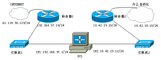 因为Windows 2000 下只允许配置一个默认网关,如果在网上邻居--〉属性里面把本地连接(内网)配上网关192.168.97.10,本地连接2(外网)配上网关10.42.29.10,表面上看是配置了2个网关,但是在DOS环境下输入route print命令查看路由表,在路由表下的default gateway只有1个网关。