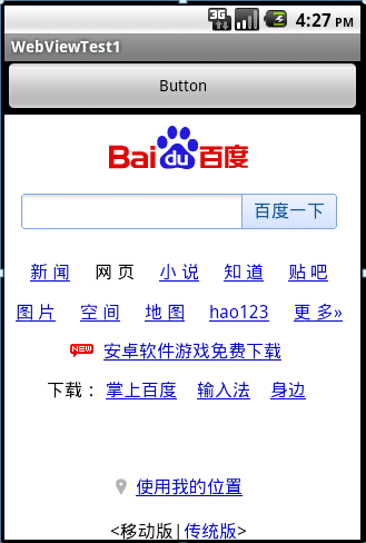 这里我们初步体验一下在android是使用webview浏览网页,在SDK的Dev Guide中有一个WebView的简单例子。在看下面这些总结知识之前,大家请看示例代码中MainActivtiy的代码,运行整个程序后,第一个页面显示的就是MainActivity的运行效果。上面的Button按钮是点击到第二个Activity进行测试用的。