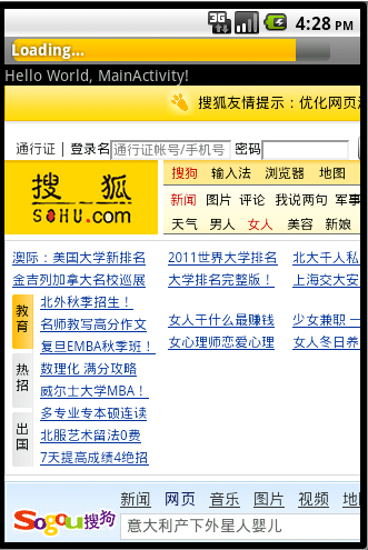 package com.parabola.main;import android.app.Activity;import android.content.Intent;import android.os.Bundle;import android.view.KeyEvent;import android.view.View;import android.view.View.OnClickListener;import android.webkit.WebView;import android.webkit.WebViewClient;import android.widget.Button;public class MainActivity extends Activity {/** Called when the activity is first created. */private WebView webview;@Overridepublic void onCreate(Bundle savedInstanceState) {super.onCreate(savedInstanceState);setContentView(R.layout.main);Button button = (Button) this.findViewById(R.id.button1);webview = (WebView) findViewById(R.id.webview);// 设置WebView属性,能够执行JavaScript脚本webview.getSettings().setJavaScriptEnabled(true);// 加载URL内容webview.loadUrl("http://www.baidu.com");// 设置web视图客户端webview.setWebViewClient(new MyWebViewClient());button.setOnClickListener(new OnClickListener() {public void onClick(View v) {Intent intent = new Intent(MainActivity.this, WebPageLoader.class);startActivity(intent);}});}// 设置回退public boolean onKeyDown(int keyCode, KeyEvent event) {if ((keyCode == KeyEvent.KEYCODE_BACK) && webview.canGoBack()) {webview.goBack();return true;}return super.onKeyDown(keyCode, event);}// web视图客户端public class MyWebViewClient extends WebViewClient {public boolean shouldOverviewUrlLoading(WebView view, String url) {view.loadUrl(url);return true;}}}package com.parabola.main;import android.app.Activity;import android.os.Bundle;import android.view.Window;import android.webkit.WebChromeClient;import android.webkit.WebView;import android.webkit.WebViewClient;public class WebPageLoader extends Activity {final Activity activity = this;@Overridepublic void onCreate(Bundle savedInstanceState) {super.onCreate(savedInstanceState);this.getWindow().requestFeature(Window.FEATURE_PROGRESS);setContentView(R.layout.webview);WebView webView = (WebView) findViewById(R.id.webView);webView.getSettings().setJavaScriptEnabled(true);webView.getSettings().setSupportZoom(true);webView.setWebChromeClient(new WebChromeClient() {public void onProgressChanged(WebView view, int progress) {activity.setTitle("Loading...");activity.setProgress(progress * 100);if (progress == 100)activity.setTitle(R.string.app_name);}});webView.setWebViewClient(new WebViewClient() {public void onReceivedError(WebView view, int errorCode,String description, String failingUrl) { // Handle the error}public boolean shouldOverrideUrlLoading(WebView view, String url) {view.loadUrl(url);return true;}});webView.loadUrl("http://www.sohu.com");}}