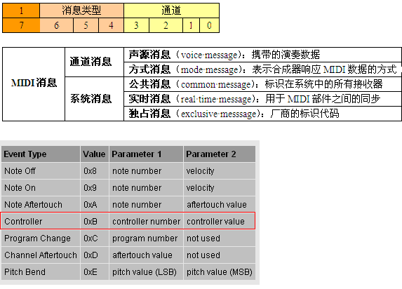 MIDI数据是一套音乐符号的定义,而不是实际的音乐,所以MIDI文件的内容被称为MIDI消息(MIDI message/MIDI event)。一个MIDI消息由1个8位的状态字节并通常跟着2个数字字节组成。在状态字节中,最高有效位设置为“1”,低4位用来表示这个MIDI消息是属于那个通道的,其余3位的设置表示这个MIDI消息是什么类型(通道消息-channel message,系统消息-system