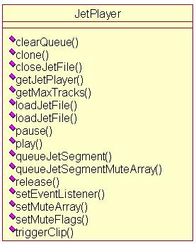 JetPlayer 是个单体类(a singleton class.),使用Static函数getJetPlayer(),就可以获取得到这个实例。JetPlayer类内部有个存放segment的队列,JetPlayer类的主要作用就是向队列中添加segment或者清空队列,其次就是控制segment的track是否处于打开状态。
