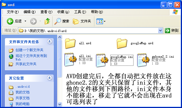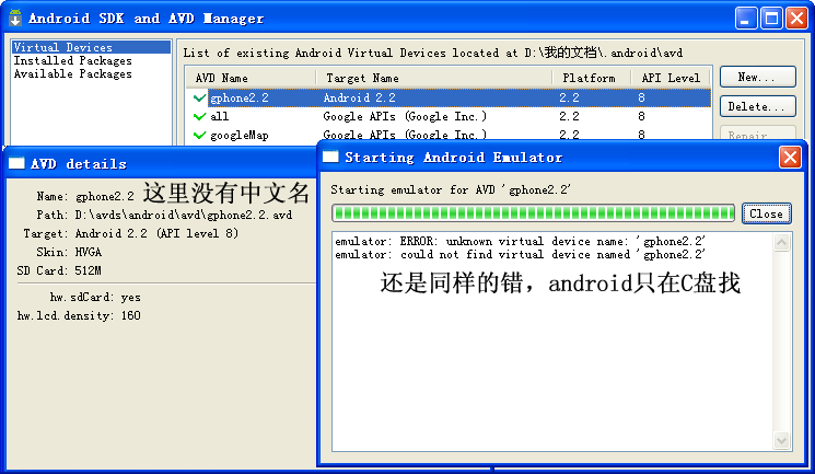 废话少说,我用是目前最新版2.2,使用"android sdk and avd manager"创建AVD(这些步骤完全是图形化的操作,不需要再像1.5那样使用命令行了),启动AVD,出现找到不文件的错误,NND,创建过程也没有出错,到硬盘看到,文件也好好的躺在那,就是提示找不到,偶然想起“梁山无用”的视频,他的AVD创建后是默认放C盘的,我的在D盘,我的系统盘也是C盘,但是我在安装完OS后,将所有有用的文件夹都迁到了D盘,如“我的文档”,所以,AVD自动创建到D盘上了,我试着将其复制到C盘C:\Documents and Settings\Administrator目录中,问题解决了,Administrator是当前登陆用户。汗啊,andriod......