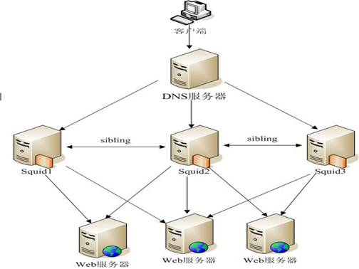 本实例的域名是 wenjin.cache.ibm.com.cn,通过DNS的轮询技术,将客户端的请求分发给其中一台 Squid 反向代理服务器处理,如果这台 Squid 缓存了用户的请求资源,则将请求的资源直接返回给用户,否则这台 Squid 将没有缓存的请求根据配置的规则发送给邻居 Squid 和后台的 WEB 服务器处理,这样既减轻后台 WEB 服务器的负载,又提高整个网站的性能和安全性。该系统结构图 3 如下: