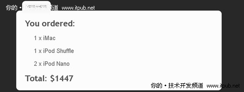 最后,我们看下当用户点结帐按钮后的页面order.php的编写,这里我们只是简单把用户的选择最后罗列出来并且进行商品价格合计,代码如下: