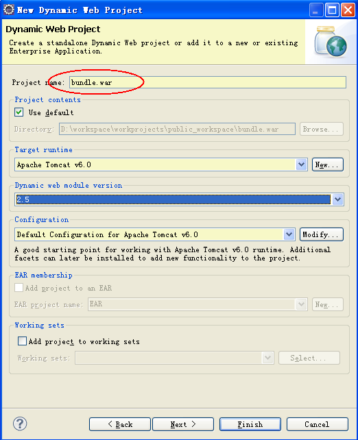 打开新建对话框,选择“Dynamic Web Project”,项目名:bundle.war, 在提示输入内容目录时,输入 webapp。
