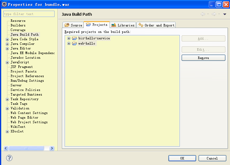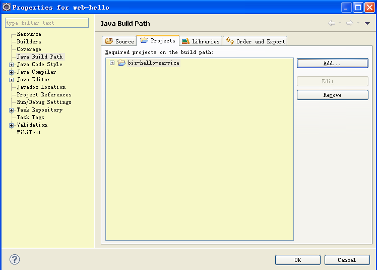 在 web-hello 工程上,点击右键菜单,选择 project property, 在 projects 依赖中选择 biz-hello-service。 因为 表示层Java代码需要依赖 业务层代码。