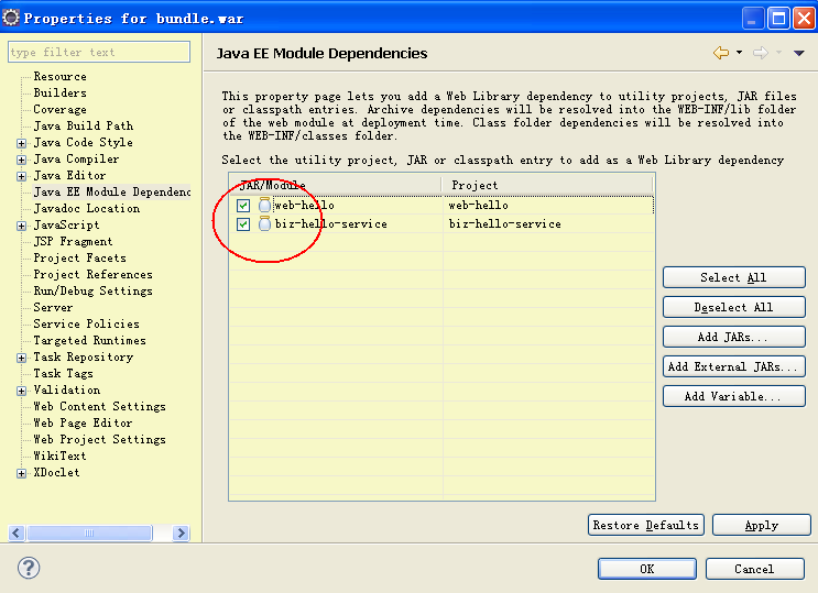 WTP 要正确运行 bundle.war 项目,还需要在 project property 对话框“Java JEE Dependencies”一节中设置依赖,如下图所示。 如果不设置,依赖的Java代码无法复制到相应位置,Java代码将无法运行。