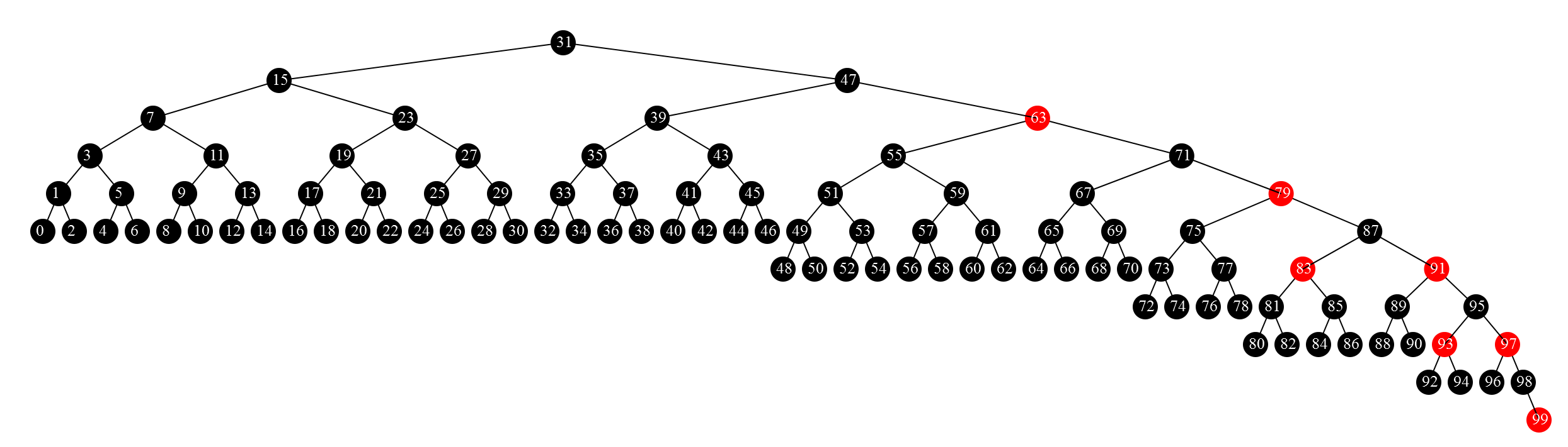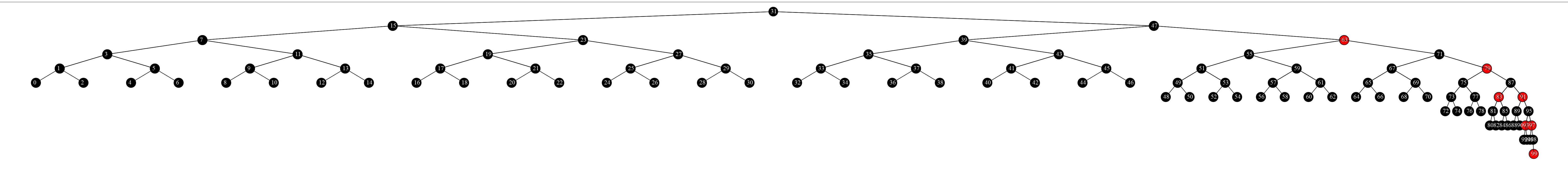 我搜到canvas可以用画图,看了看,然后就琢磨用这东西画树了,最开始就是画圆和线,然后画二叉树。我的第一个版本的红黑树效果如图1,但高度比较高但没有子节点的相邻节点之间的距离太大,所以图看着很别扭。最后和同事探讨了一下算法,总算弄的好看了,效果如图2。页面地址:http://www.zlong.org/js-practice/red_black_tree.html(只能用chrome/firefox/opera/safari/IE9看)。