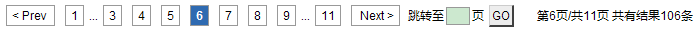 /** * @described 分页组件 * @author xuxb * @see 通过jquery完成页面数据的分页工具栏 pagetoolbar * @see 用于缓解页面数据量过大而导致页面停顿或假死现象 * @mark 定义的局部变量为私有变量 提供对应的方法进行操作, 如 this.totalSize = totalSize; 将破坏对象的封装 * @created 2011-05-30 */var pageInfo = null; // 全局分页信息var PAGE_SIZE = 10;  // 每页显示多少条function turnPage(pageNo) { // 翻页操作pageInfo.currentPage = pageNo;pageInfo.show();}function PageComponent(totalSize, pageSize, currentPage) {this.totalSize = totalSize;this.pageSize = pageSize;this.currentPage = currentPage;this.toolbarSize = 7; // 默认的页码个数  (奇数可以保持页码对称)this.step = 3;  // 当前页码的前、后页码数(步长)if (PageComponent._init==undefined) {  // 调用初始化方法 -- this.init();PageComponent._init = 1;}}PageComponent.prototype.init = function() {   // 完成一些初始化动作init//$("#tipPage").text(this.getTipPage());};PageComponent.prototype.getStartIndex = function() {  // 获取开始索引值if (this.currentPage == 1) return 0;else return (this.currentPage - 1) * this.pageSize;};PageComponent.prototype.getEndIndex = function() {  // 获取结束索引值if (this.currentPage == 1) return this.pageSize;else if (this.currentPage * this.pageSize >= this.totalSize) {return this.totalSize;}else {return this.currentPage * this.pageSize;}};PageComponent.prototype.getPageCount = function() { // 获取总页数return Math.ceil(this.totalSize / this.pageSize);};PageComponent.prototype.getUpPage = function() {  // 获取上一页 页码if (this.currentPage - 1 < 1) return 1;return this.currentPage - 1;};PageComponent.prototype.getDownPage = function() { // 获取下一页 页码if (this.currentPage >= this.getPageCount()) return this.getPageCount();return this.currentPage + 1;};PageComponent.prototype.getFirstPage = function() { // 获取下一页 页码return 1;};PageComponent.prototype.getTipPage = function() { // 获取提示信息return "第" + this.currentPage + "页/共" + this.getPageCount() + "页  共有结果" + this.totalSize + "条";};PageComponent.prototype.computePage = function() {$("#toolbar").hide();//$("#tipPage").text(this.getTipPage());//$("#firstPage").val(this.getFirstPage());//alert($("#upPage").val());//$("#upPage").val(this.getUpPage());//$("#downPage").val(this.getDownPage());//$("#endPage").val(this.getPageCount());$("#tipPage").html(this.getTipPage());$("#toolbar").show();};PageComponent.prototype.pageToolbar = function() {//公式/* * 重新理思路 * 1. 根据当前页码生成待生成的JSON格式页码 如{"< Prev":"1","2":"2",....,"Next >":"2"} * 2. 可分为2种情况实现  */var jsonArray = new Array();var items = "";jsonArray.push('"< Prev ":"'+this.getUpPage()+'"'); // 上一页jsonArray.push('"'+this.getFirstPage()+'":"'+this.getFirstPage()+'"'); // 首页if (this.getPageCount() <= this.toolbarSize) {// 情况一:需要生成的页码小于或等于默认值for (var i = 1; i <= this.getPageCount(); i++) {if (this.currentPage<=this.yardage*2) {jsonArray.push('"'+i+'":"'+i+'"'); // 格式如下 "2":"2"}}} else { // 情况二:需要生成的页码大于默认值var start = parseInt(this.currentPage)-parseInt(this.step); // 3var end = parseInt(this.currentPage)+parseInt(this.step);if (start<this.step) {  // 起始值小于stepstart=2;end=start+2*this.step-1;}else if (end>this.getPageCount()) { // 结束值大于总页数end=this.getPageCount();start=end-2*this.step;}for (var i=start; i<=end; i++) {if(i==start&&start>=this.step) { // first...jsonArray.push('"first...":"..."');}jsonArray.push('"'+i+'":"'+i+'"'); // 格式如下 "2":"2"if (i==end&&end<this.getPageCount()-1) { // after...jsonArray.push('"after...":"..."');}}}jsonArray.push('"'+this.getPageCount()+'":"'+this.getPageCount()+'"'); // 末页jsonArray.push('" Next >":"'+this.getDownPage()+'"');// 下一页jsonArray = "{" + jsonArray.join(",") + "}";jsonArray = $.parseJSON(jsonArray);var temp = this.currentPage;  // 保存当前页码值//var regx = /^\d+$/;$.each(jsonArray, function(i, n) {if (!isNaN(n)) {items += "<li";if (temp==n&&i==n) { // 当前页和当前待生成的页码一样, 并且生成页码的key和value相等。items += " class='currentpage'";} else if (temp==n&&i!=n) {// 1.若当前页没有上一页,上一页按钮css为dispage// 2.若当前页没有下一页,下一页按钮css为dispageitems += " class='dispage'";} else {items += " onclick='javascript:turnPage("+n+");'";}items += ">&nbsp;"+i+"&nbsp;</li>"} else {items += n; // ... 省略号}});$("#ulpage").empty();$("#ulpage").append(items);};PageComponent.prototype.addClass = function(className) { // 鼠标悬停切换样式$(".ulpage li").bind("mouseover mouseout", function() {$(this).toggleClass(className);});};PageComponent.prototype.show = function(pageNo) {if (pageNo!=null&&pageNo!="") {  // 可以接收参数,当前页码this.currentPage = pageNo;}/* * 前置条件: *  1.当前页码大于0 *  2.总记录数大于0 *  3.当前页码必须小于总页码 */if (this.currentPage > 0 && this.totalSize > 0 && this.currentPage <= this.getPageCount()) {this.computePage();this.pageToolbar();this.addClass("ulpageunderline");  // 样式ulpageunderlinevar hidepart = $("#table2 tr:not(.list_table_tr)"); // 隐藏部分CSS的id选择器hidepart.hide();for (i = this.getStartIndex(); i < this.getEndIndex(); i++) {hidepart.eq(i).show();}}};