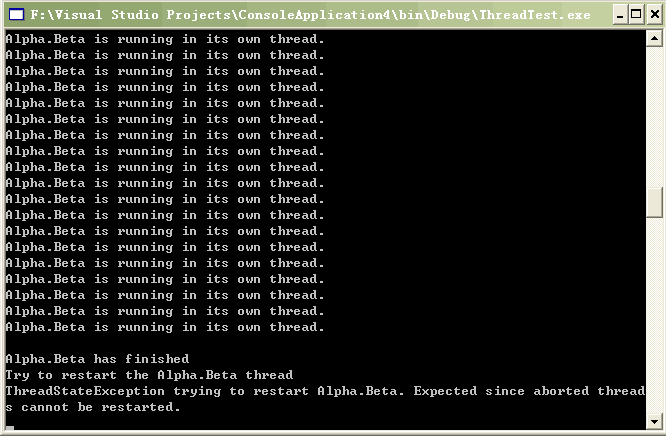 Console.Write("ThreadStateException trying to restart Alpha.Beta. ");
