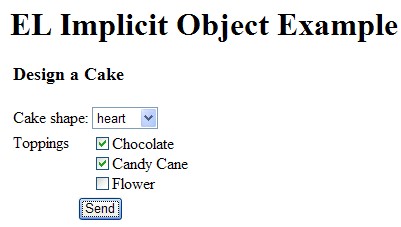 <%@ taglib prefix="c" uri="http://java.sun.com/jsp/jstl/core"%><!DOCTYPE HTML PUBLIC "-//W3C//DTD HTML 4.01 Transitional//EN"><html> <head> <title>EL Implicit Object Example</title> </head> <body> <h1>EL Implicit Object Example</h1> <form action="form_view.jsp" method="post"> <table> <tr><td colspan="2"><h3>Design a Cake</h3></td></tr> <tr> <td>Cake shape:</td> <td> <select name="shape"> <option>round</option> <option>square</option> <option>heart</option> </select> </td> </tr> <tr> <td valign="top">Toppings</td> <td> <input type="checkBox" name="topping" value="Chocolate">Chocolate<br> <input type="checkBox" name="topping" value="Candy Cane">Candy Cane<br> <input type="checkBox" name="topping" value="Flower">Flower<br> </td> </tr> <tr> <td colspan="2"> <center><input type="submit" value="Send"></center> </td> </tr> </table> </form> </body></html>