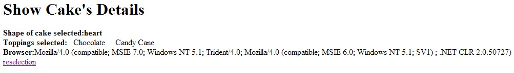 <%@ taglib prefix="c" uri="http://java.sun.com/jsp/jstl/core" %><!DOCTYPE HTML PUBLIC "-//W3C//DTD HTML 4.01 Transitional//EN"><html> <head> <title>Show Cake's Details</title> </head> <body> <h1>Show Cake's Details</h1> <b>Shape of cake selected:${param.shape}</b><br> <b>Toppings selected:</b><c:forEach var="stuff" items="${paramValues.topping}"> ${stuff} </c:forEach><br> <b>Browser:</b>${header["user-agent"]}<br> <a href="implicit_obj.jsp">reselection</a> </body></html>