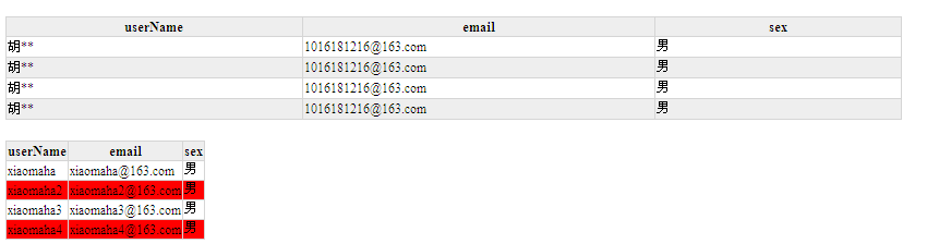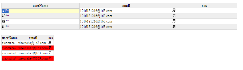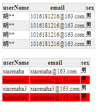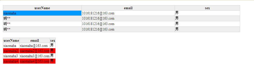 (function($){ $.fn.bestTable = function(options) { /** * isDrog 是否可以拖动表头宽度 * oddtrBackgroundColor odd背景颜色 * isEffect 是否开启鼠标特效 * effectBackgroundColor 鼠标移动后的背景色 * isEditor 是否开启可编辑状态 * isEditorNewColor 编辑状态背景色 * isEditorNewColor 是否开启编辑后状态 * editorNewColorBackgroundColor 编辑后背景色 */var defaults = {isDrog : true,oddtrBackgroundColor:"#EEE",isEffect:true,effectBackgroundColor:"#CCCCCC",isEditor:true,editorBackgroundColor:"#FFFFCC",isEditorNewColor:true,editorNewColorBackgroundColor : "0099FF"};var opts = $.extend(defaults, options); var backgroundColor='background-color';$(this).each(function(){//获取当前tablevar newTable= $(this);//是否允许拖动表头if(opts.isDrog)drog(newTable); //鼠标拖动th$(newTable).find("tbody tr:odd").css(backgroundColor,opts.oddtrBackgroundColor);//获取当前table中tbody中的tdvar newtd = $(newTable).find('tbody td');//编辑状态(鼠标变手形)和鼠标特效状态(改变背景色)都需要给当前td设置mouseovernewtd.mouseover(function(){//保存当前td的背景色var oldbackgroundColor=$(this).css(backgroundColor);if(opts.isEffect)//启动特效状态{$(this).css({'cursor':'pointer',backgroundColor:opts.effectBackgroundColor});//修改鼠标为手状、修改背景色$(this).mouseout(function(){$(this).css({backgroundColor:oldbackgroundColor}); //光标移开后恢复到最初背景色});}});//不允许编辑if(!opts.isEditor)return false;//单击tdnewtd.click(function(){var td = $(this);//判断当前td中是否已经包含了inpu文本框if(td.children("input").length>0){return false};//为当前td添加一个编辑框临时input var inputObject = $("<input type='text'/>").height("100%").width("100%").css({ "font-size":td.css("font-size"), backgroundColor:opts.editorBackgroundColor, "border-width":0 }); //取消当前input文本框单击事件 inputObject.click(function(){return false}); //获取td文本框放入一个变量 var tdText = td.html(); //将td中的文本框赋值给input中 inputObject.val(tdText); //将input放入td文本框当中 td.html(inputObject); //选中编辑区域 兼容所有浏览器 inputObject.trigger("focus").trigger("select"); inputObject.blur(function(){ //恢复td的文本 td.html(tdText); //删除input $(this).remove(); }); //键盘 inputObject.keydown(function(event){ var keyCode = event.which; switch(keyCode){ case 13: var inputText = $(this).val(); td.html(inputText); $(this).remove(); if(!opts.isEditorNewColor)return false; td.css(backgroundColor,opts.editorNewColorBackgroundColor); break; case 27: td.html(tdText); $(this).remove(); break; } }); });}); //很少的代码实现拖动表头function drog(table){var tr = $(table).find("thead tr");var th = $(table).find('thead tr th');$(tr).mousemove(function(event){$(this).css("cursor","e-resize");});$(th).mousedown(function(event){$(this).mousemove(function(e){var width = $(this).width();var px = e.clientX-event.clientX;$(this).width(width+px);});});$(th).mouseup(function(){$(th).unbind('mousemove');});} }; })(jQuery); <!DOCTYPE HTML PUBLIC "-//W3C//DTD HTML 4.01 Transitional//EN"><html> <head> <title>a.html</title> <meta http-equiv="keywords" content="keyword1,keyword2,keyword3"> <meta http-equiv="description" content="this is my page"> <meta http-equiv="content-type" content="text/html; charset=UTF-8"> <script type="text/javascript" src="js/jquery.min.js"></script> <script type="text/javascript" src="js/jquery.bestTable.js"></script><script type="text/javascript">$(document).ready(function() { //最简单配置 默认配置 $('table#demo').bestTable(); //按需求配置 $('table#demo2').bestTable({ isDrog:false, //不允许拖动表头宽度 oddtrBackgroundColor:'red', //改变odd背景色 isEffect:false, //关闭鼠标滑动特效 isEditorNewColor:false //编辑完成后不改变背景色 }); }); </script><style>table { border: solid 1px #D5D5D5; border-collapse: collapse; height:auto; }tbody td {border:1px solid #D5D5D5;font-size:12px;}thead th {border:1px solid #D5D5D5;background-color:#EEE;font-size:12px;}</style> </head> <body> <!-- demo --> <table id="demo"> <thead> <tr> <th>userName</th> <th>email</th> <th>sex</th> </tr> </thead> <tbody> <tr> <td>胡**</td> <td>1016181216@163.com</td> <td>男</td> </tr> <tr> <td>胡**</td> <td>1016181216@163.com</td> <td>男</td> </tr> <tr> <td>胡**</td> <td>1016181216@163.com</td> <td>男</td> </tr> <tr> <td>胡**</td> <td>1016181216@163.com</td> <td>男</td> </tr> </tbody> </table> <br/> <!-- demo2 --> <table id="demo2"> <thead> <tr> <th>userName</th> <th>email</th> <th>sex</th> </tr> </thead> <tbody> <tr> <td>xiaomaha</td> <td>xiaomaha@163.com</td> <td>男</td> </tr> <tr> <td>xiaomaha2</td> <td>xiaomaha2@163.com</td> <td>男</td> </tr> <tr> <td>xiaomaha3</td> <td>xiaomaha3@163.com</td> <td>男</td> </tr> <tr> <td>xiaomaha4</td> <td>xiaomaha4@163.com</td> <td>男</td> </tr> </tbody> </table> <span id="a"></span><br/><span id="b"></span><br/><span id="c"></span><br/><span id="d"></span><br/> </body></html>
