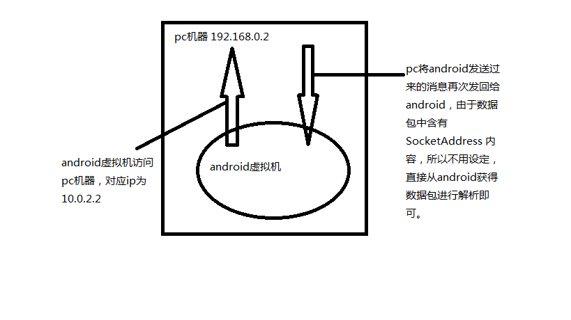 【android】与pc机进行UDP通信(二) 上次讲到android虚拟机和pc机进行通讯,现在就将小程序复杂一点点。pc将获得的数据原封不动得再发给android虚拟机。示例图:代码在原来的基础上进行了补充: