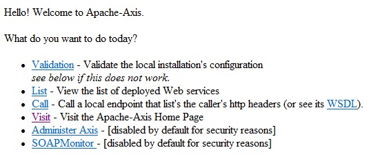 点击上图中的Validataion链接,页面上会提示已经有的包和缺少的包的信息,根据提示将必须的包下载全,将这些类包复制到 %tomcathome%/webapps/axis/WEB-INF/lib/目录下重新启动tomcat,直到Validation页面中看不到有Error与Warning的提示信息。