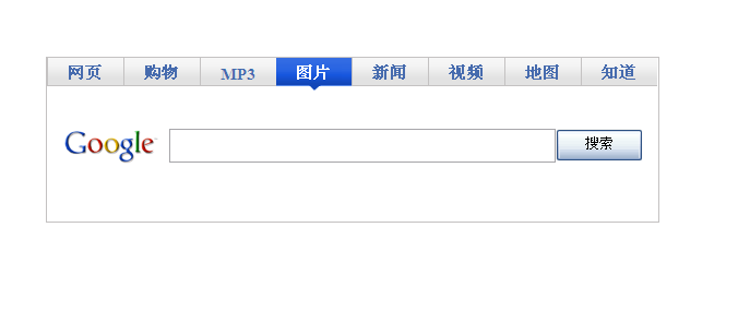 <script type="text/javascript">$(document).ready(function (){$("ul").find("a").click(function (){$("ul").find("a").removeClass("choose");$(this).addClass("choose");$("#search").attr("name",$(this).attr("id"));$("#img").attr("src",$(this).attr("name")+'.png');});$("#doSubmit").click(function (){var value = $("#search").val();var name = $("#search").attr("name");var addr = encodeURI('http://www.google.com/search?q='+value+'&newwindow=1');switch(name){case "google":addr=encodeURI('http://www.google.com/search?q='+value+'&newwindow=1');break;case "baidu_mp3":addr=encodeURI('http://mp3.baidu.com/m?f=ms&rf=idx&tn=baidump3&lf=&rn=&word='+value+'&lm=-1#1')break;case "google_pic":addr=encodeURI('http://www.google.com.hk/images?source=hp&newwindow=1&biw=1280&bih=856&gbv=2&aq=f&aqi=&oq=&q='+value+'&tbm=isch')}window.location = addr;});});</script><style type="text/css">* { margin:0; padding:0;}img,ul,li,a,p{border:0; list-style-type:none;}.main {margin-left: auto; margin-right: auto;width:560px;height:150px;border:1px solid #C4C2C2;margin-top:150px;}.title {position:relative;width:560px;height:30px;}.title ul li a{float:left;width:69px;height:25px;line-height:30px;text-align:center;font-weight:900;font-size:15px;color:#466BAE;background:url("background.png");text-decoration: none;border-left:1px solid #C4C2C2;border-bottom:#c4c2c2 1px solid;}.title .choose{color:#fff;height:30px;border:0;background:url("li_now.png");}.content {position:relative;width:552px;height:90px;padding-top:35px;}.search{position:relative;height:50px;margin-left:15px;}.search img {float:left;margin-right:10px;}.search input {float:left;}.search .text {width:350px;height:27px;line-height:27px;}.search .button {width:80px;height:30px;}.clear{clear:both;}</style>