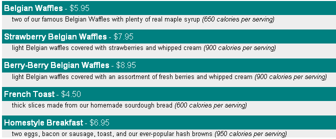 <?xml version="1.0" encoding="ISO-8859-1"?><!-- Edited with XML Spy v2007 (http://www.altova.com) --><?xml-stylesheet type="text/xsl" href="simple.xsl" ?><breakfast_menu><food><name>Belgian Waffles</name><price>$5.95</price><description>two of our famous Belgian Waffles with plenty of real maple syrup</description><calories>650</calories></food><food><name>Strawberry Belgian Waffles</name><price>$7.95</price><description>light Belgian waffles covered with strawberries and whipped cream</description><calories>900</calories></food><food><name>Berry-Berry Belgian Waffles</name><price>$8.95</price><description>light Belgian waffles covered with an assortment of fresh berries and whipped cream</description><calories>900</calories></food><food><name>French Toast</name><price>$4.50</price><description>thick slices made from our homemade sourdough bread</description><calories>600</calories></food><food><name>Homestyle Breakfast</name><price>$6.95</price><description>two eggs, bacon or sausage, toast, and our ever-popular hash browns</description><calories>950</calories></food></breakfast_menu>