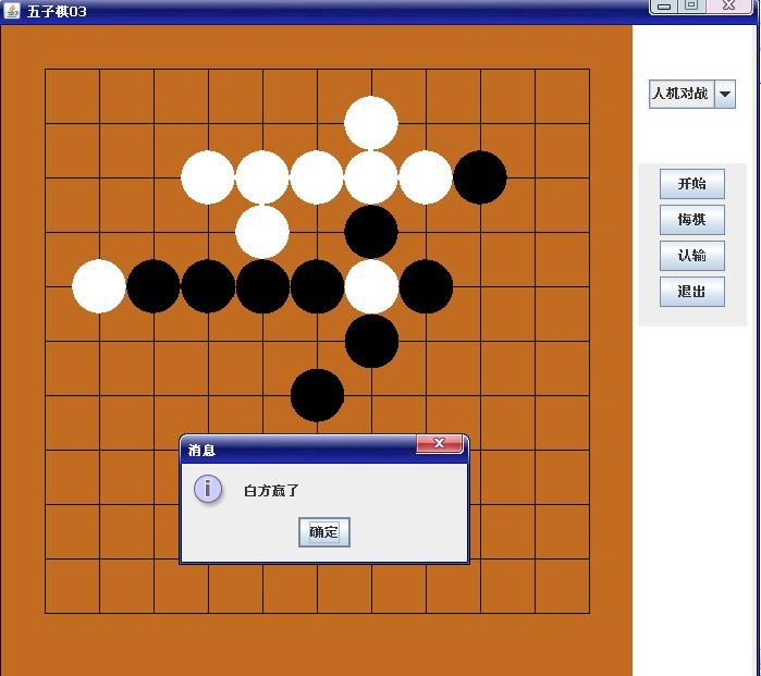 else {//人机对战System.out.println(MenuJPanel.jc.getSelectedItem());if(chesses[i][j]==0) {//当前无子时才能放g.setColor(Color.black);//玩家下黑子g.fillOval(x - CHESS_SIZE / 2, y - CHESS_SIZE / 2,CHESS_SIZE, CHESS_SIZE);//下子之后该点权值赋值为1chesses[i][j]=-1;//电脑找权值最大的点放子g.setColor(Color.white);//遍历两棋盘 new MaxValue(VALUES_PALYER).lookforMaxValue(-1);//黑子为-1 new MaxValue(VALUES_COM).lookforMaxValue(1);//白字为1/在两个权值数组中找最大权值的点MaxValuep=getMAXVALUE(VALUES_PALYER);MaxValuec=getMAXVALUE(VALUES_COM);if(VALUES_PALYER[MaxValuep.y][MaxValuep.x]<=VALUES_COM[MaxValuec.y][MaxValuec.x]) {//进攻Max=MaxValuec;}else {//防守Max=MaxValuep;}int xx = X0+Max.x*SIZE;int yy = Y0+Max.y*SIZE;//最大权值坐在点的坐标(由下标转化而来)chesses[Max.y][Max.x]=1;g.fillOval(xx - CHESS_SIZE / 2, yy - CHESS_SIZE / 2,CHESS_SIZE, CHESS_SIZE);