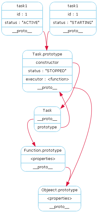 function Task(id) {this.id = id;}Task.prototype.status = "STOPPED";Task.prototype.execute = function(args) {return "execute task_" + this.id + "[" + this.status + "]:" + args;}var task1 = new Task(1);var task2 = new Task(2);task1.status = "ACTIVE";task2.status = "STARTING";alert(task1.execute("task1"));alert(task2.execute("task2"));