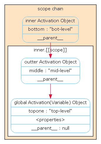 var topone = "top-level";(function outter() {var middle = "mid-level";(function inner() {var bottom = "bot-level";alert(topone + ">" + middle + ">" + bottom);})();})();
