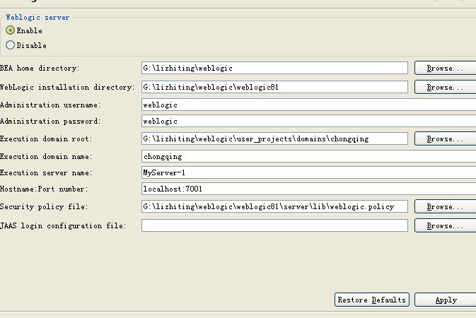 3. 相应Eclipse配置: domain name 与第一步对应,server name与部署到得server对应。