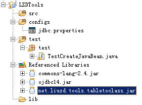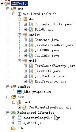 package test;import net.liuzd.tools.db.entity.JavaDataBaseBean;import net.liuzd.tools.db.entity.JdbcInfo;import net.liuzd.tools.db.util.JavaSourceFactory;/** * @author liuzd * @version 1.0 * @since 1.5 * @time 2011-09-23 * 网名:咫尺天涯 * 博客:http://liuzidong.iteye.com/ */public class TestCreateJavaBean {private static final long serialVersionUID = 1L;public static void main(String[] args) {String packageName = "net.liuzd.tools.db";String classFilePath = "E:/net/liuzd/tools/db";//生成一个类文件的演示String tableName = "TUSER";String className = "Tuser";//请把拷贝的java代码格式化: Ctrl+F//*******第一种:生成一个java类文件的方式*********************///JavaSourceFactory.create(tableName,packageName,className,classFilePath);//支持链式风格编程:请确保一定要传入以下四个必备元素,否则报错/*JavaSourceFactory.create(new JavaDataBaseBean().setTableName(tableName).setPackageName(packageName).setClassName(className).setClassFilePath(classFilePath));*//*******第二种:生成多个java类文件的方式*********************///默认读取jdbc.properties配置文件中的数据库连接方式//JavaSourceFactory.create(packageName, classFilePath, new String[]{"x","x"});//指定读取用户所在库的多个表/*JavaSourceFactory.create(packageName, classFilePath,new JdbcInfo("orcl","orcl","jdbc:oracle:thin:@192.168.10.1:1521:orcl","oracle.jdbc.driver.OracleDriver"),"x","x");*//*******第三种:生成用户下所有表对应的java类文件********************///默认读取jdbc.properties配置文件中的数据库连接方式JavaSourceFactory.create(packageName, classFilePath);//创建指定用户下所有的类文件/*JavaSourceFactory.create(packageName, classFilePath,new JdbcInfo("orcl","orcl","jdbc:oracle:thin:@192.168.10.1:1521:orcl","oracle.jdbc.driver.OracleDriver"));*/}}