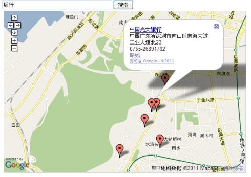 Google 本地搜索 实例 下午把以前的代码翻出来整理,发现有好多好东西都丢失了 ~~~下面是一个用于搜索某个位置附近的信息的例子,效果图如下当时主要是为了得到某地附近的银行的经纬度信息,参考网上的例子写的.代码如下: