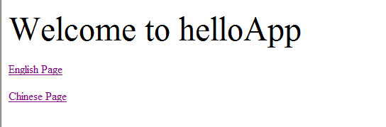 <%@ page language="java" import="java.util.*" pageEncoding="UTF-8"%><html> <head> <title>welcome to hello jsp</title> </head> <body> <p><font size=7>Welcome to helloApp</font></p> <p><a href="WelcomeLogin.jsp?language=English">English Page</a></p> <p><a href="WelcomeLogin.jsp?language=Chinese">Chinese Page</a></p> </body></html>