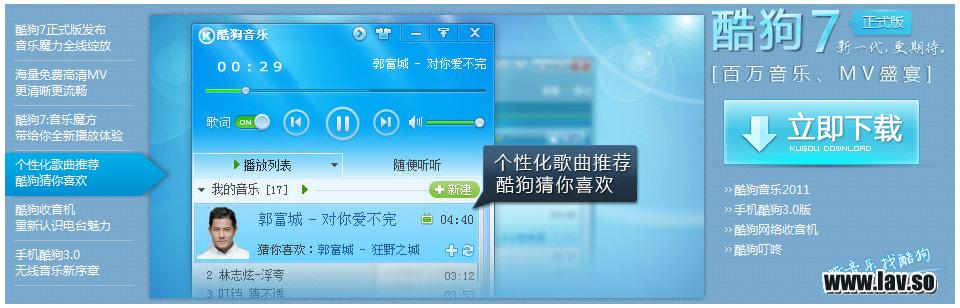 焦点广告插件,之前最熟悉的莫过于FLASH制作的,结合JS调入数据,定时进行切换,同时也能根据自己需要选择。而现在随着jquery的应用,类似焦点广告等插件都是使用JS来实现,相信大家也看到过很多类似的插件,如土豆、奇艺等网站,在页面固定的位置放置多个信息进行轮换,以达到用最少的空间展示更多的内容。最近看到酷狗播放器7的界面不错,也看了下其官网,发现首页焦点广告的制作显得过于粗糙,而且在首页停留时间过长还会出现图片重叠,原因是通过更改图片透明度来切换造成的,时间过长导致切换不够彻底,以至于已经切换了的图片还可以看到。于是就想着模仿一个类似效果的插件,今天已经实现了效果,日后再整理下代码拿出来分享。个人觉得相比酷狗官网目前的效果来说是好多了,自夸下,嘿嘿。还差一个定时播放功能,后期再完善!