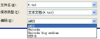 其实读者可以用WinXP的记事本试试。如下图,ANSI对于我们来说就是GBK,Unicode就是UTF-16(LE),Unicode big endian就是UTF-16(BE),UTF-8当然就是下面即将要介绍的UTF-8。可以把文章保存下来,用不同的编码保存,然后用UE看看十六进制。