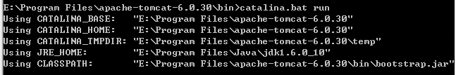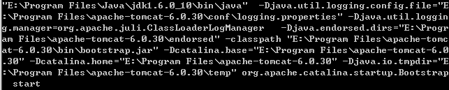 双击startup.bat会检查CATALINA_HOME环境变量,然后调用catalina.bat start,catalina.bat里面会检查CATALINA_HOME、CATALINA_BASE环境变量、并调用setclasspath.bat检查JAVA_HOME、JRE_HOME环境变量、设置JAVA_OPTS等,这些脚本的详细说明网上也很多,最后实际上执行了这样一个命令: